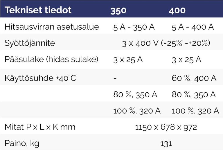 Hitsaus » Hitsauskoneet » EWM » MIG Hitsauskoneet » EWM Taurus XQ 400 Synergic hitsauskonepaketti EWM Taurus XQ 400 Synergic hitsauskonepaketti 6 874,45 € Tuotekoodi 400.SYNERGIC Määrä Lisää tilaukseen Saatavuus Tilaustuote Lisätiedot › Paketti sisältää:• TAURUS XQ 400 C SYNERGICW R1 H• blueCool -10 5L• AK300 lankakela adapteri• Maakaapeli 70mm2 4m• Kaasuletku 2x1/4" 2m• PM 551 W RD3 X m9 4m hitsauspoltin Näytä lisää tuotteitaMIG Hitsauskoneet tuoteryhmästä