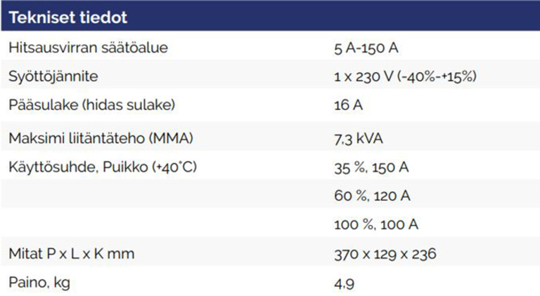 Kompakti, kannettava hitsauskone kaikkeen puikkohitsaukseen. Helppokäyttöinen ja tehokas puikkohitsauskone perusominaisuuksilla. Toimii luotettavasti myös pitkillä kaapelietäisyyksillä ja generaattorikäytössä. Kone soveltuu hyvin mm. rakennuksille, maatalouteen ja kaikenlaisiin asennustöihin ja korjaushitsauksiin.
