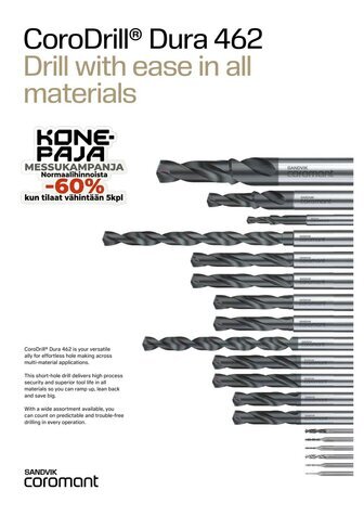 Sandvik Coromant on globaali markkinajohtaja, joka tarjoaa innovatiivisia ja tehokkaita työkaluja metallin työstöön. Sopimusasiakkaanamme saat suoran pääsyn yli 54 000 Sandvik Coromant -tuotteen valikoimaan, joka kattaa mm. sorvaus-, jyrsintä-, poraus- ja kierteitysratkaisut. Paranna tuottavuutta ja koneistuksen laatua Sandvikin huipputeknologialla.
