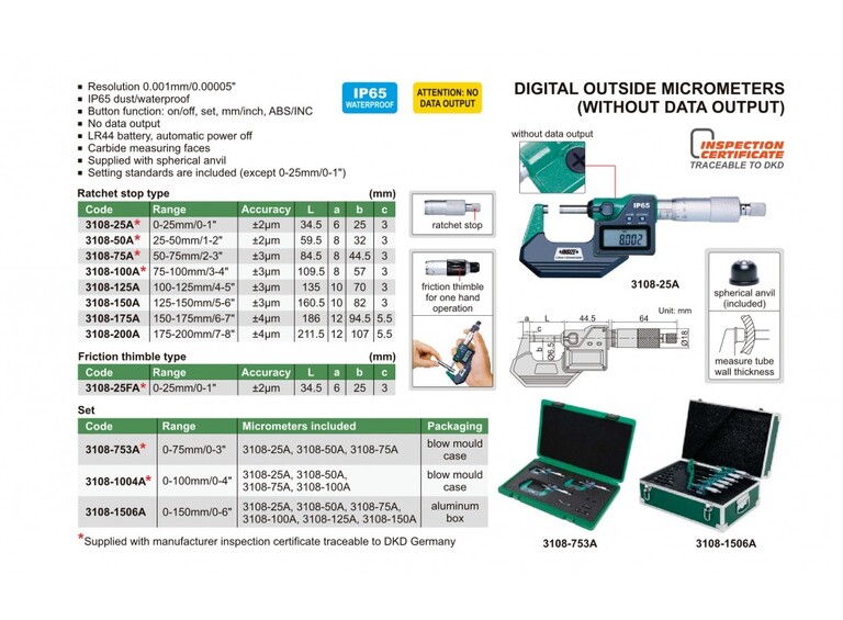 • Asetusstandardit sisältyvät (paitsi 0-25mm/0-1")