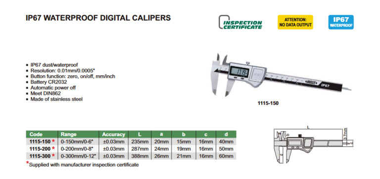 Koneistus » Mittalaitteet » Työntömitat » Insize 200mm IP67 digi työntömitta Insize 200mm IP67 digi työntömitta 97,75 € Tuotekoodi 1115-200 Määrä Lisää tilaukseen Saatavuus Varastossa (1 kpl) IP67 pöly / vedenpitävä• Resoluutio: 0.01 mm / 0.0005"• Painikkeen toiminto: nolla, on / off, mm / tuuma• Paristo CR2032• Automaattinen virrankatkaisu• Valmistettu ruostumattomasta teräksestä Lisätiedot › IP67 pöly / vedenpitävä• Resoluutio: 0.01 mm / 0.0005"• Painikkeen toiminto: nolla, on / off, mm / tuuma• Paristo CR2032• Automaattinen virrankatkaisu• Valmistettu ruostumattomasta teräksestä Näytä lisää tuotteitaTyöntömitat tuoteryhmästä