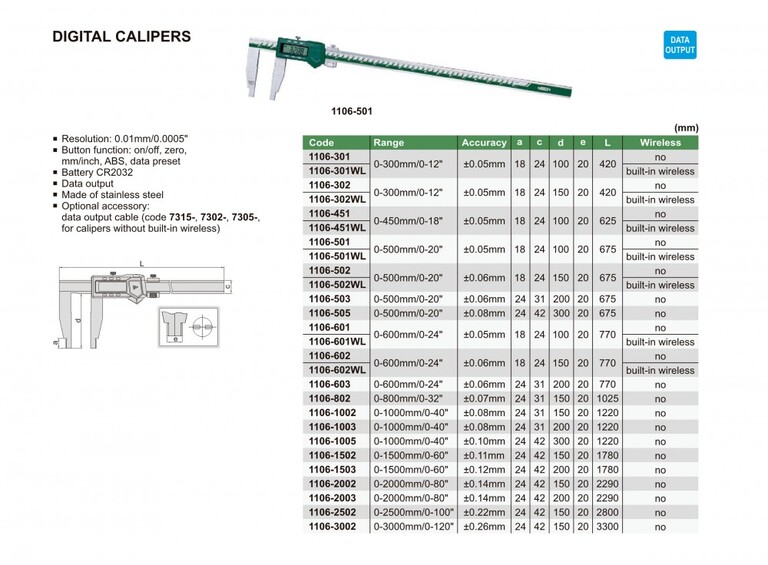 Koneistus » Mittalaitteet » Työntömitat » Insize 500mm digi työntömitta Insize 500mm digi työntömitta 181,05 € Tuotekoodi 1106-501 Määrä Lisää tilaukseen Saatavuus Tilaustuote Ei vedenpitävä• Resoluutio: 0.01 mm / 0.0005"• Painikkeet: on / off, nolla, mm / tuuma• Automaattinen virrankatkaisu• Paristo: CR2032 Lisätiedot › Ei vedenpitävä• Resoluutio: 0.01 mm / 0.0005"• Painikkeet: on / off, nolla, mm / tuuma• Automaattinen virrankatkaisu• Paristo: CR2032 Näytä lisää tuotteitaTyöntömitat tuoteryhmästä