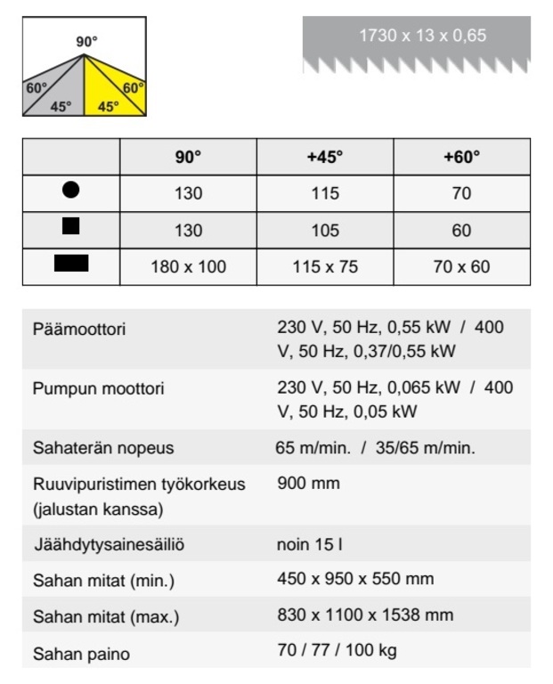 • Sahaterän nopeus: 65 m/min. / 35/65 m/min.