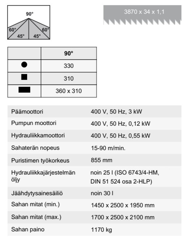 • Sahaterän nopeus: 15-90 m/min.
