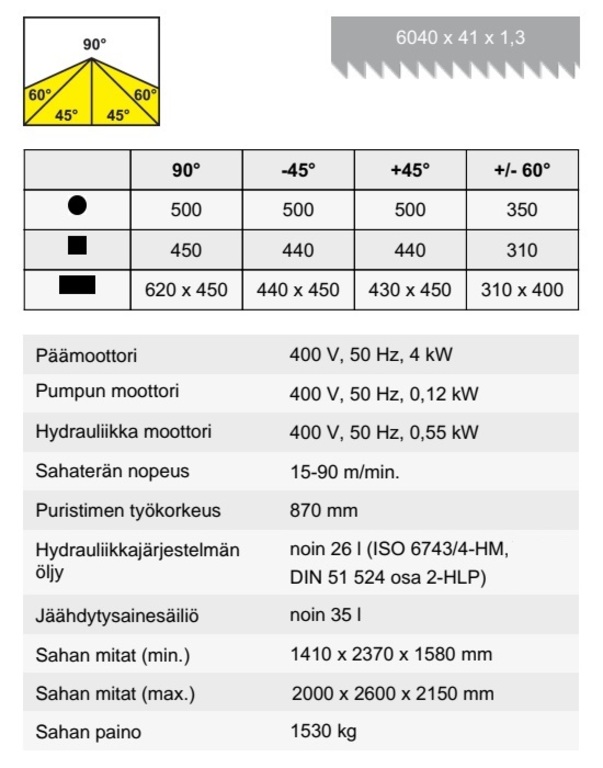 • Sahaterän nopeus: 15-90 m/min.