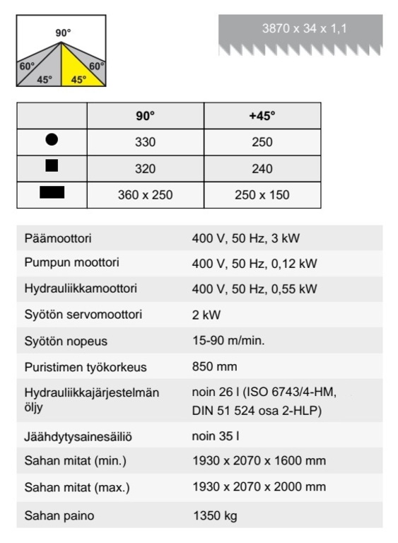 • Päämoottori: 400 V, 50 Hz, 3 kW